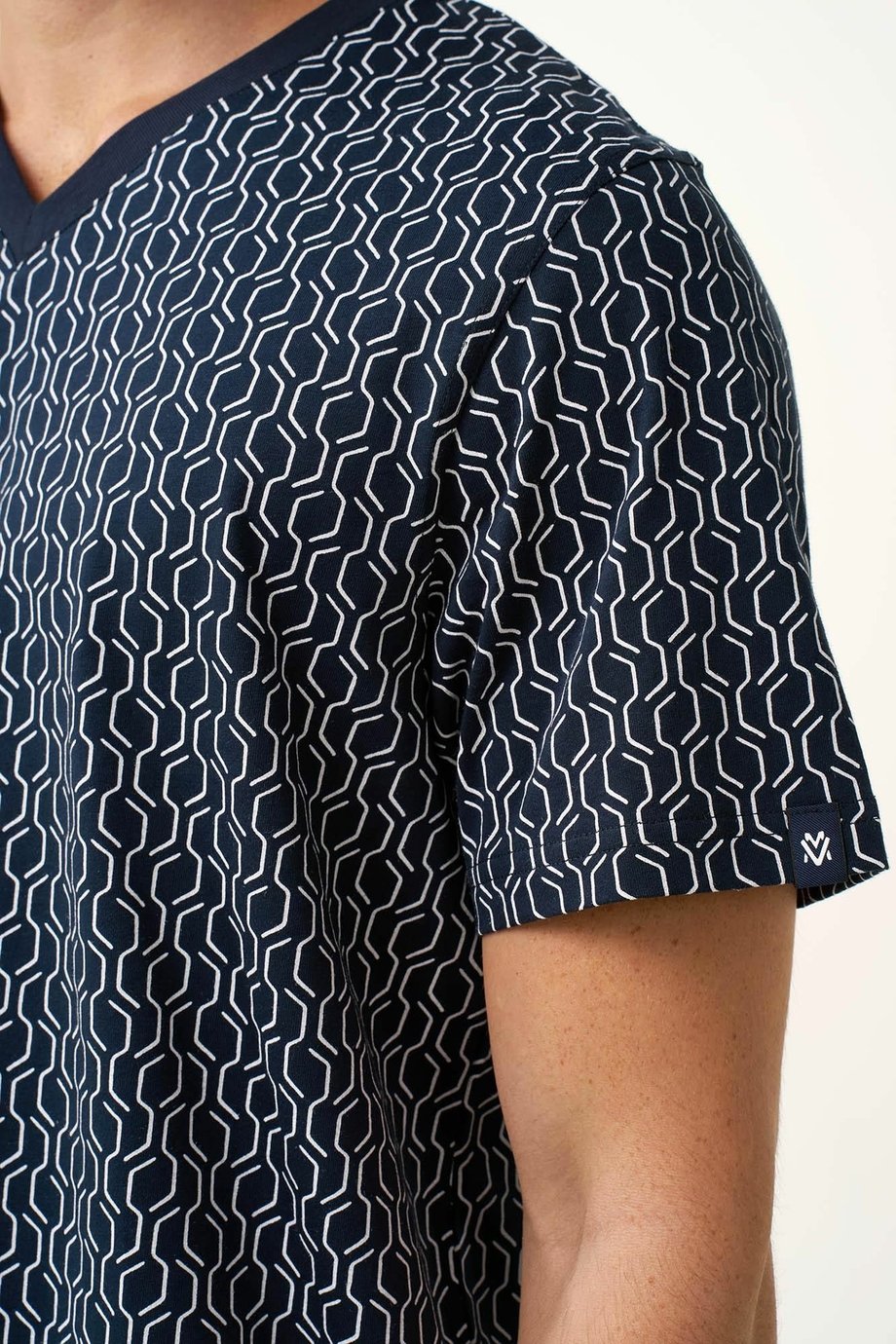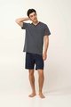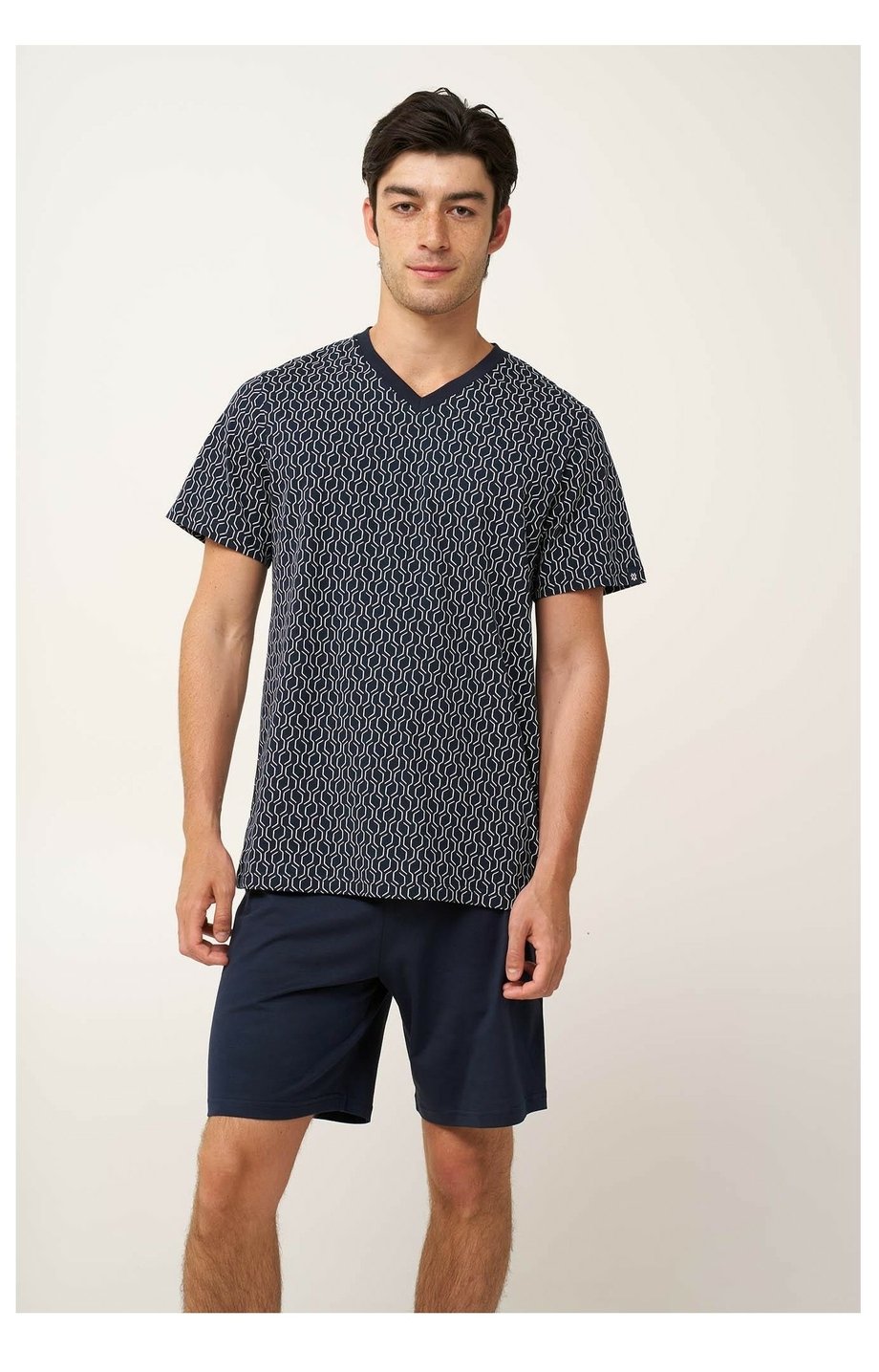 Pohodlné krátké pánské bavlněné pyžamo VAMP s výstřihem do V pro kvalitní spánek a volný čas. Na jednobarevných kraťasech je zadní kapsa. Horní díl je zdobený originálním tiskem a výstřih je kontrastně lemován.