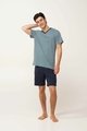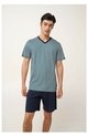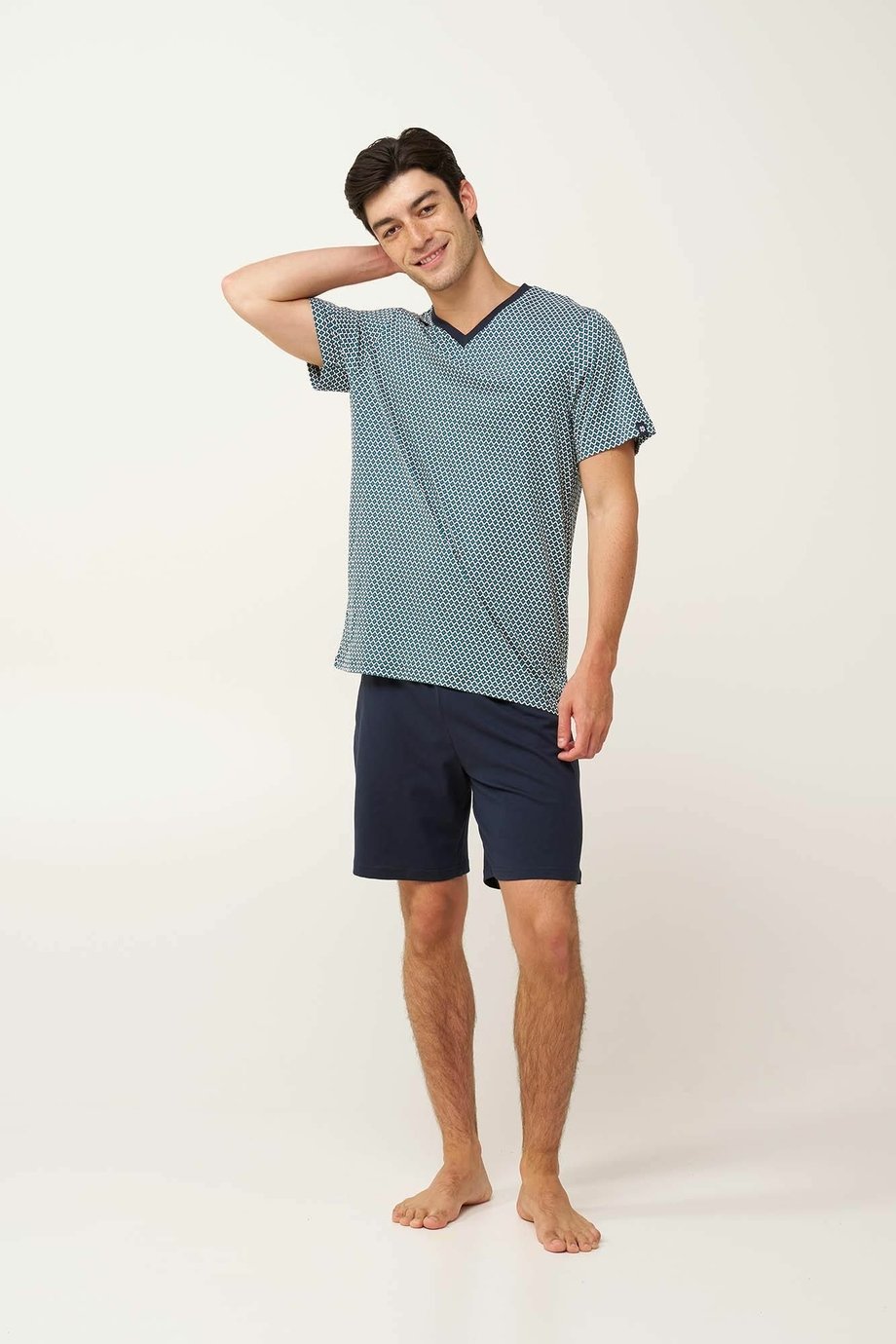 Pohodlné krátké pánské bavlněné pyžamo VAMP s výstřihem do V pro kvalitní spánek a volný čas. Na jednobarevných kraťasech je zadní kapsa. Horní díl je zdobený originálním tiskem a výstřih je kontrastně lemován.