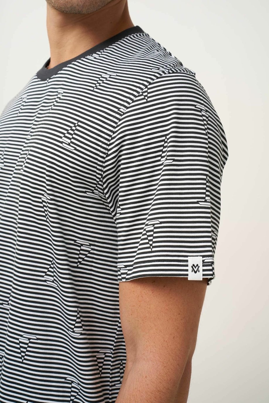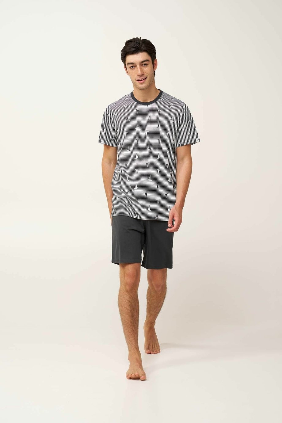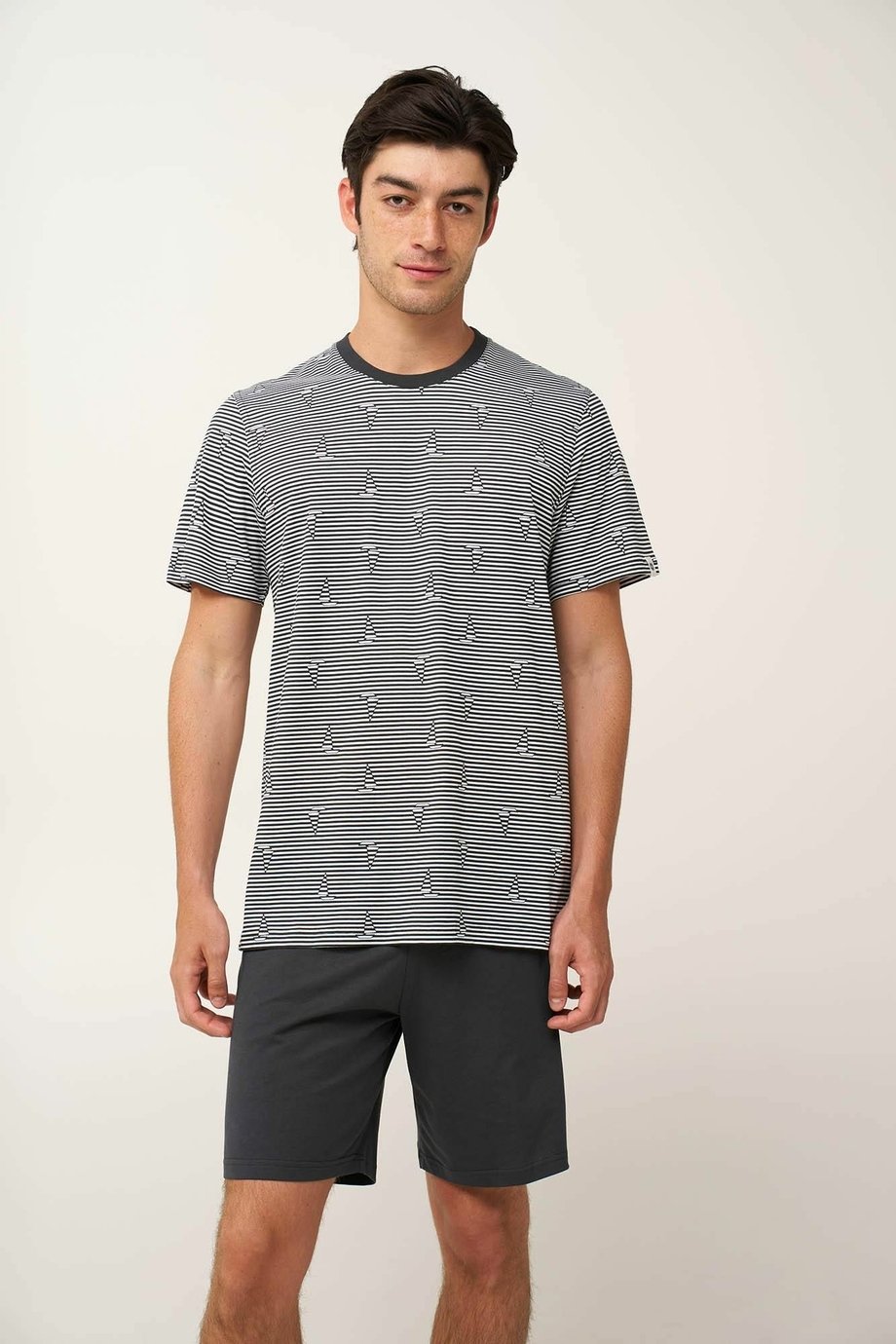Pohodlné krátké pánské pyžamo VAMP s kulatým výstřihem pro kvalitní spánek a volný čas. Na jednobarevných kraťasech je zadní kapsa. Horní díl je zdobený originálním tiskem plachetnic na pruhovaném základě a výstřih je kontrastně lemován.