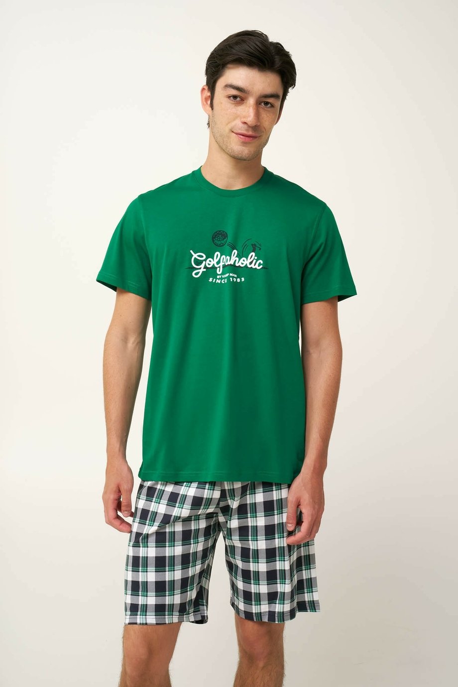 Pohodlné krátké pánské pyžamo VAMP s kulatým výstřihem pro kvalitní spánek a volný čas. Na kostkovaných kraťasech je zadní kapsa. Horní díl je zdobený originálním tiskem s golfovým motivem.