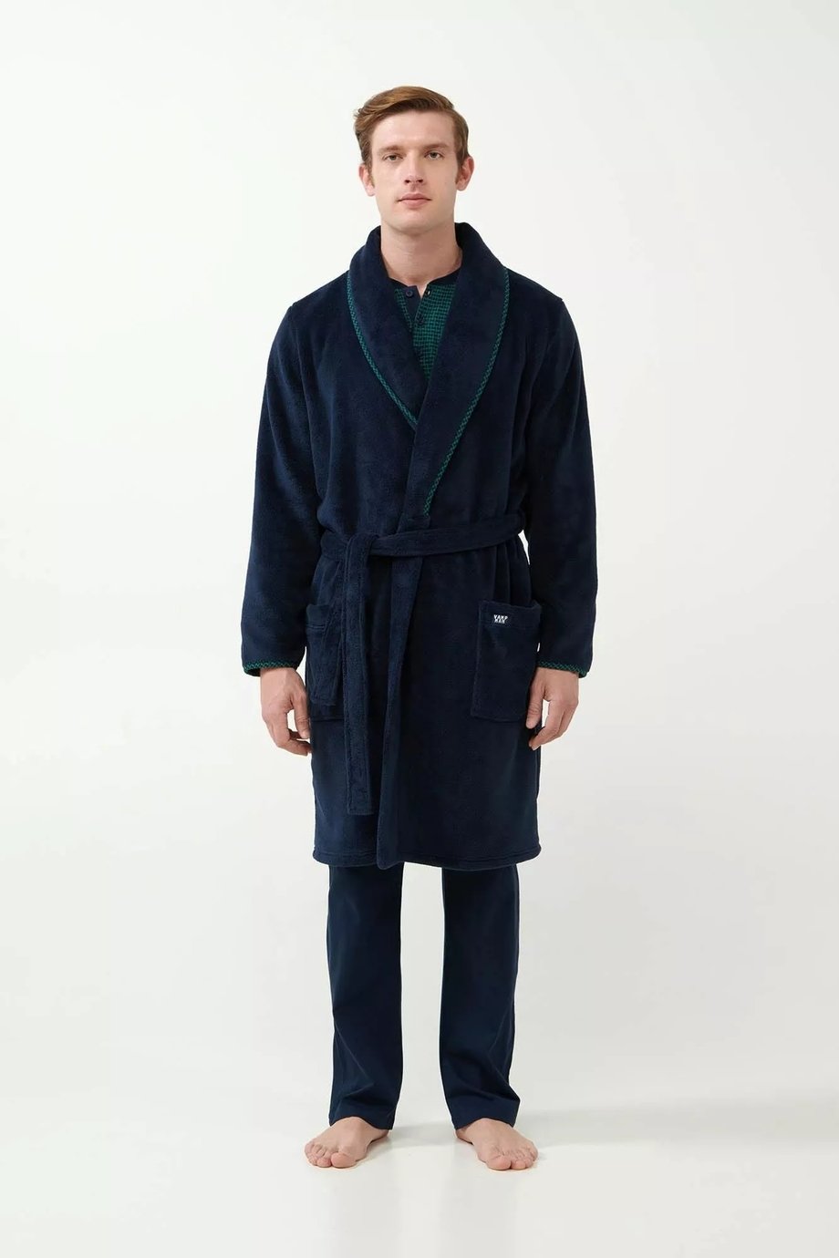 Pánský hřejivý župan VAMP se šálovým límcem, dvěma kapsami a vázačkou. Límec a rukávy jsou kontrastně lemovány. Župan je idální pro domácí odpočinek a kombinuje klasický styl s vynikající měkkostí pro váš dokonalý zážitek z lenošení.